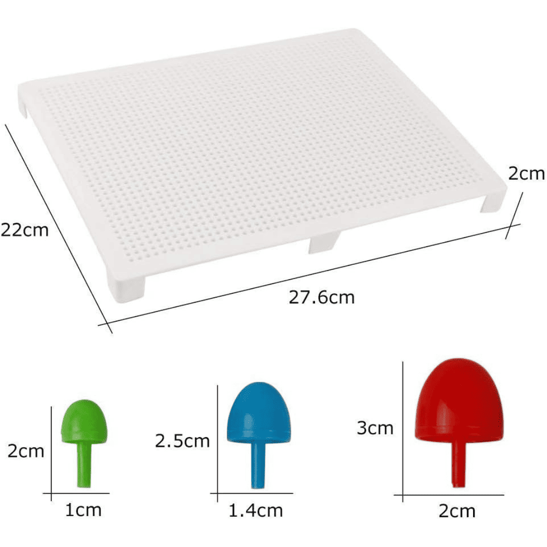 • Set mengandungi 296 keping pin cendawan pelbagai saiz dan warna, 1 papan peg (pegboard), dan 1 bakul penyimpanan bertangkai.