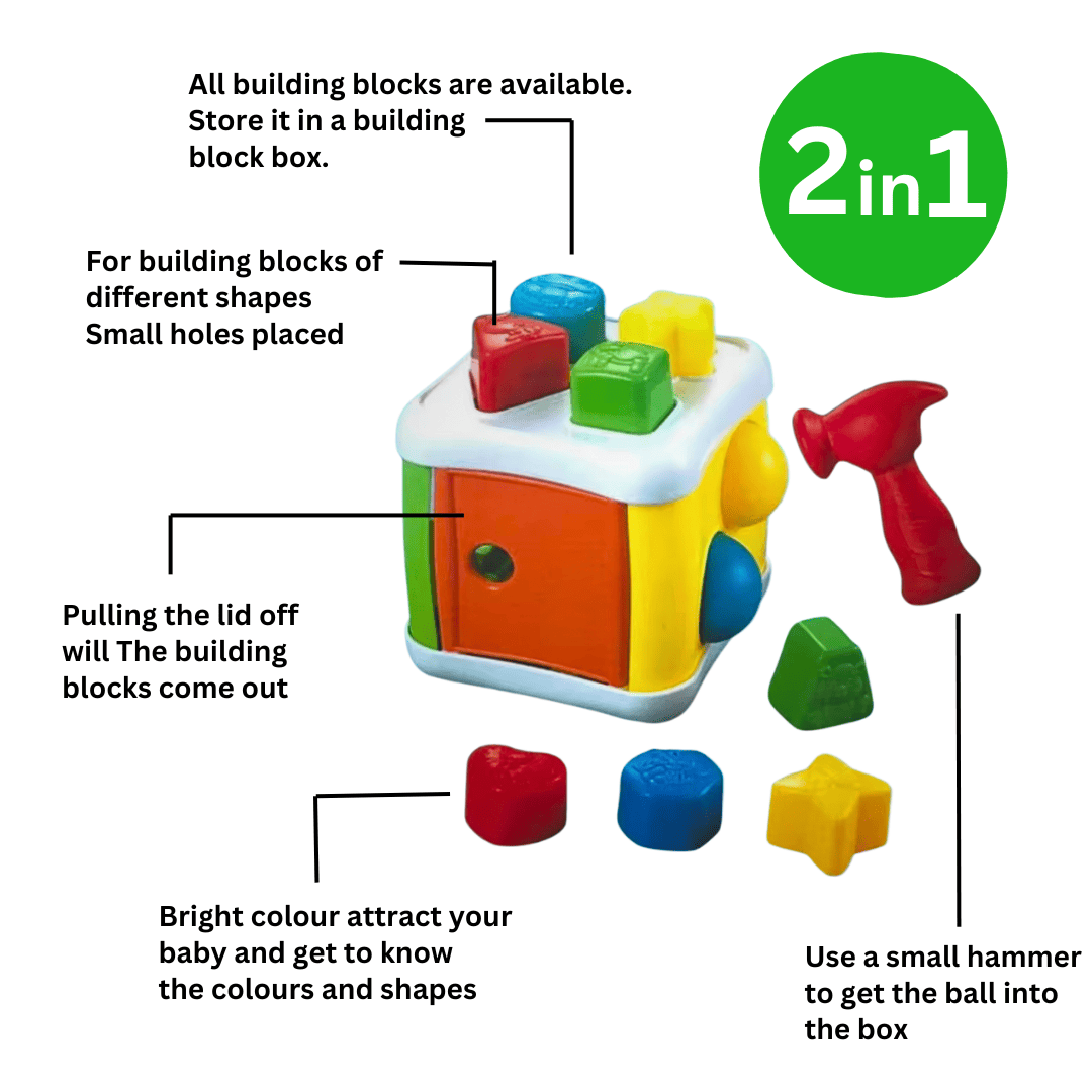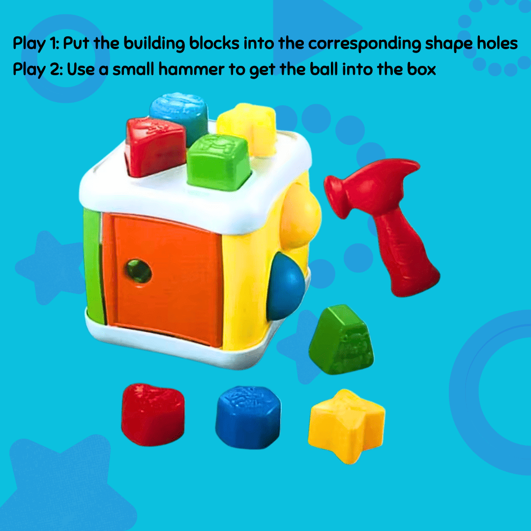 Mainan 2 dalam 1 yang menyeronokkan! Anak boleh belajar mengenal bentuk dan warna sambil mengetuk bola ke dalam kotak — melatih koordinasi tangan-mata dan kemahiran motor halus dengan cara yang seronok dan selamat.
