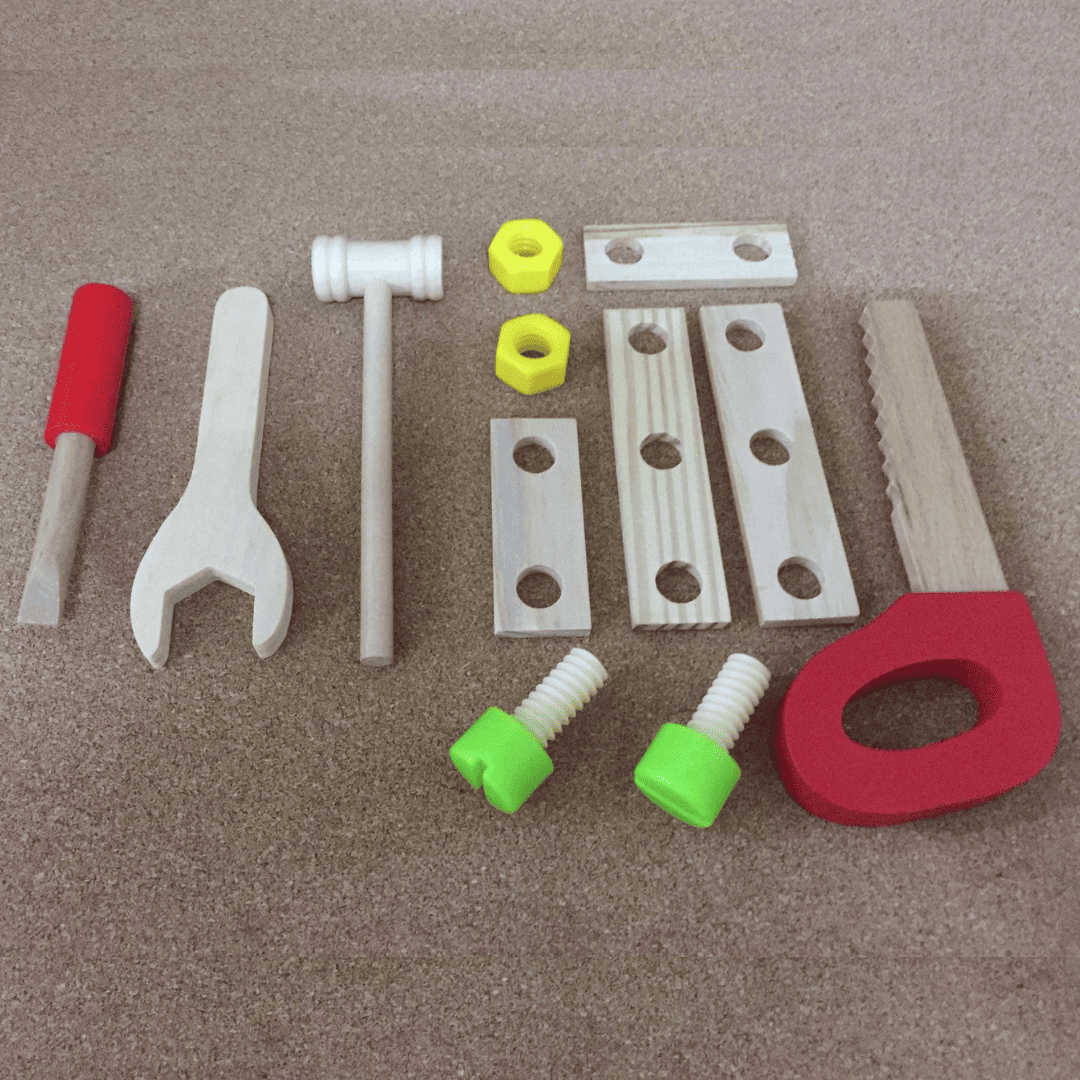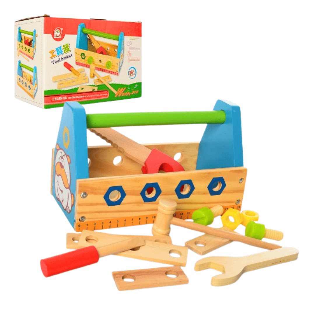 • Set kotak alat tukang kayu kayu berwarna-warni lengkap dengan 13 alat kecil seperti penukul, pemutar skru, gergaji, spanar, nat, bolt dan penyambung.